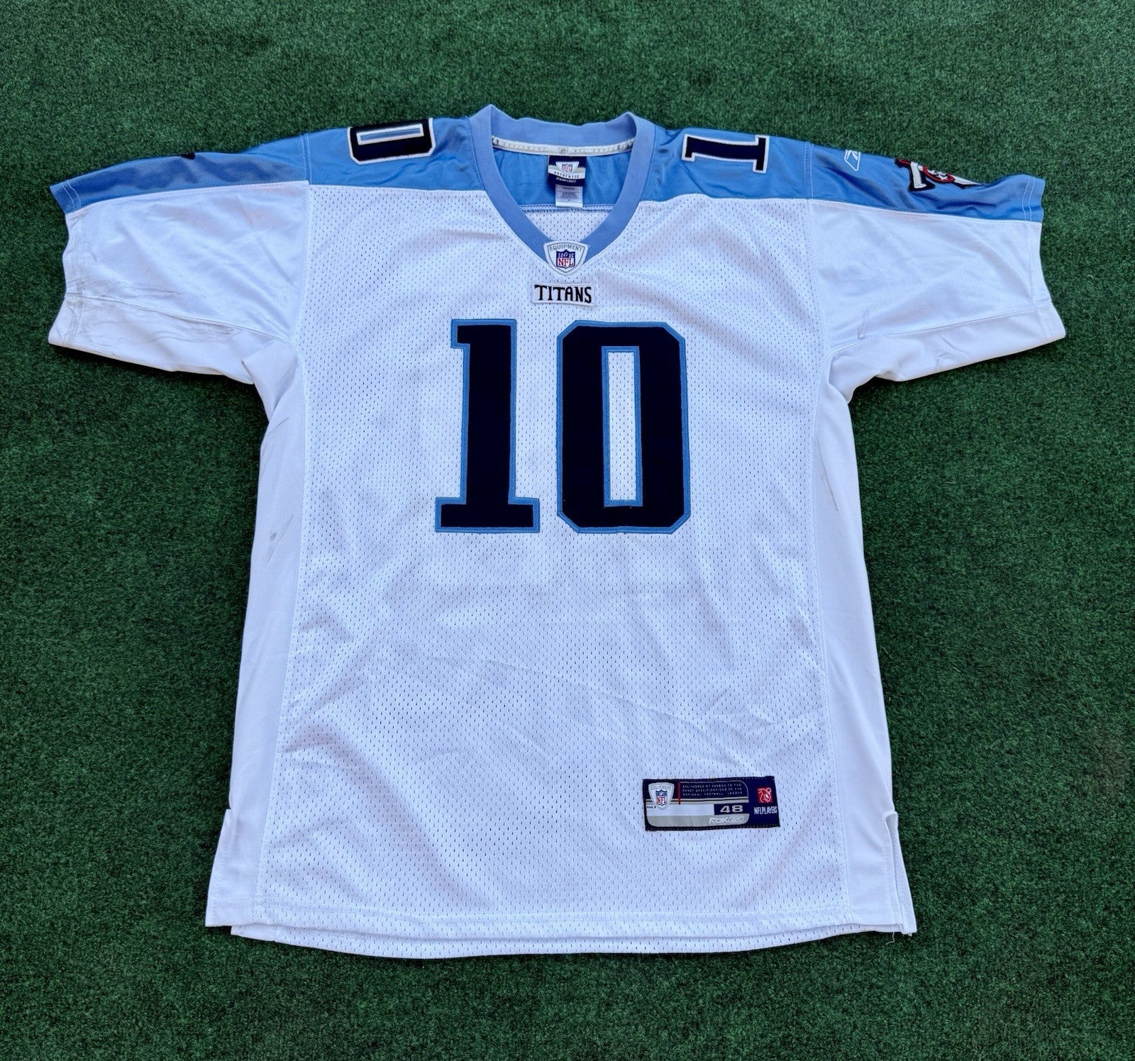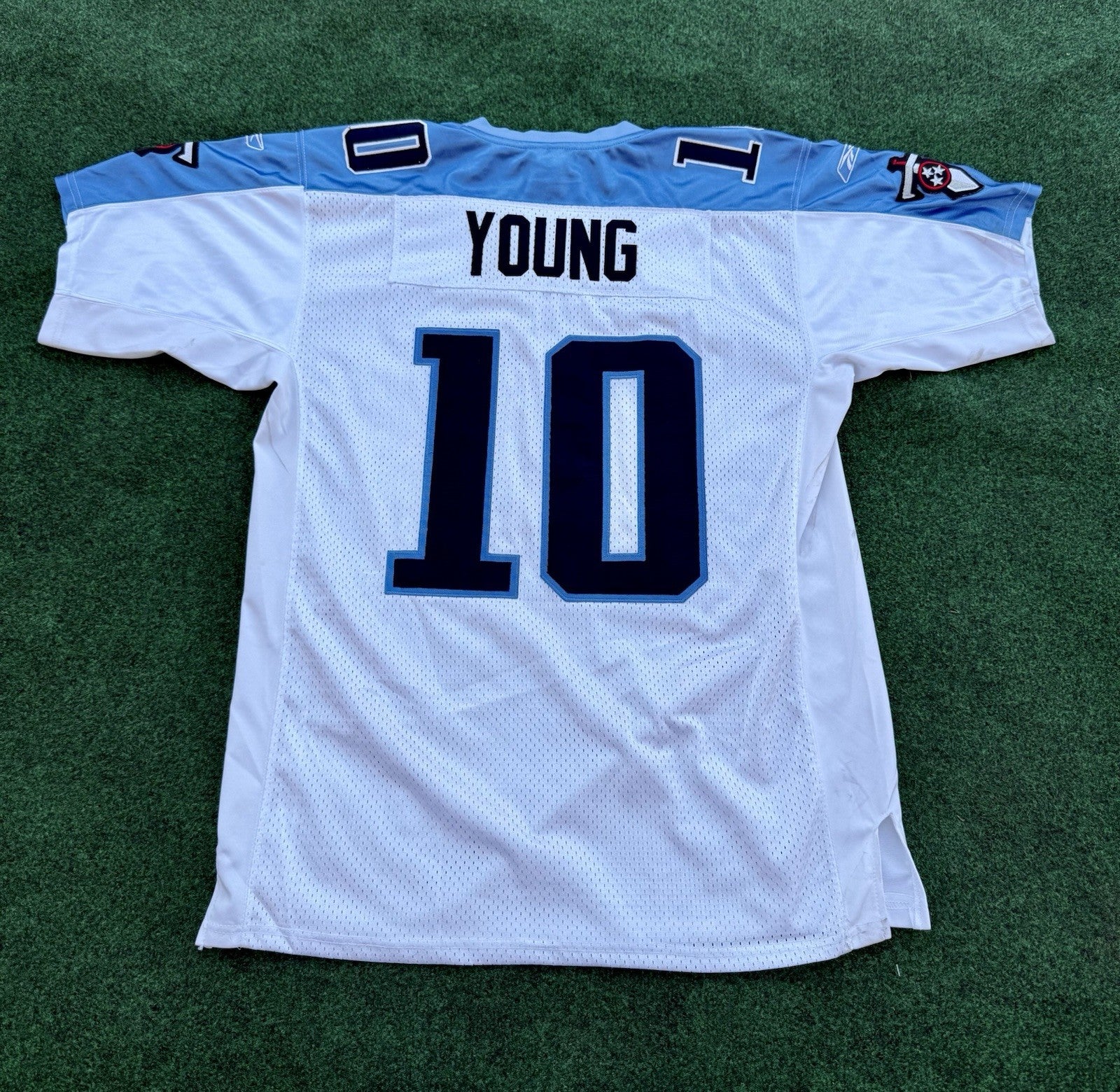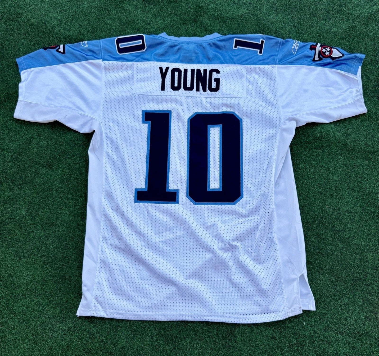 The product is an authentic white Reebok jersey of Vince Young, the former quarterback for the Tennessee Titans in the National Football League (NFL). It is officially licensed by the league and designed specifically for men in size 48. The jersey is ideal for fans looking to show their support for the Titans during the regular season games. This product is 100% real and not a replica, making it a valuable collectible for football enthusiasts.